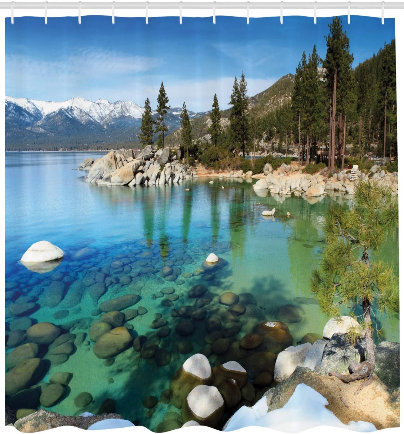 Ambesonne Lake Tahoe Shower Curtain, Scenic American Places Mountains Snow Rocks in The California Summer, Cloth Fabric Bathroom Decor Set with Hooks, 69" W x 75" L, Turquoise Evergreen