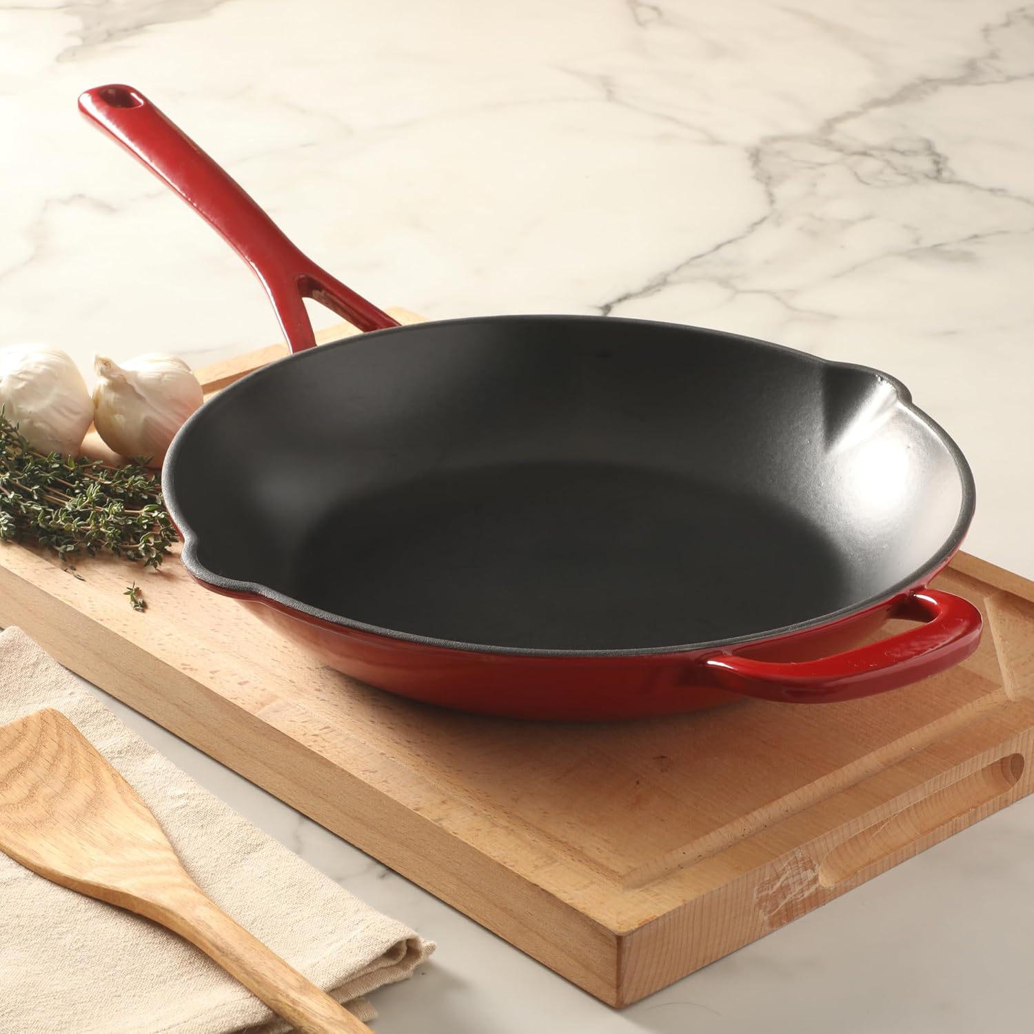 The Martha Stewart Gatwick Enameled Cast Iron Skillet offers exceptional versatility and durability for preparing a wide range of delicious recipes every day. Part of the best‑selling Gatwick collection, it features durable cast iron construction—similar to the well‑known Dutch ovens from the same line—designed to distribute and retain heat evenly for frying, searing, baking, and more.The vibrant enamel finish resists stains for beautiful presentation and easier cleanup. Sturdy handles provide balance and support when serving from oven to table. Safe in the oven (up to 500°F) and on all cooking surfaces, including induction stovetops, this skillet delivers both style and performance to inspire home cooks to explore and do more in the kitchen. Hand wash only.Embrace thoughtfully designed home essentials from America’s most trusted lifestyle expert, Martha Stewart. Step into her exquisite and iconic world filled with a curation of high-quality products to prep, cook, bake, serve, and enjoy. All crafted to elevate everyday homemaking and seasonal entertaining, these kitchen and tabletop pieces blend style and performance, inspiring avid hosts and home cooks to set stylish tables, serve up delicious meals, and create spectacular memories.